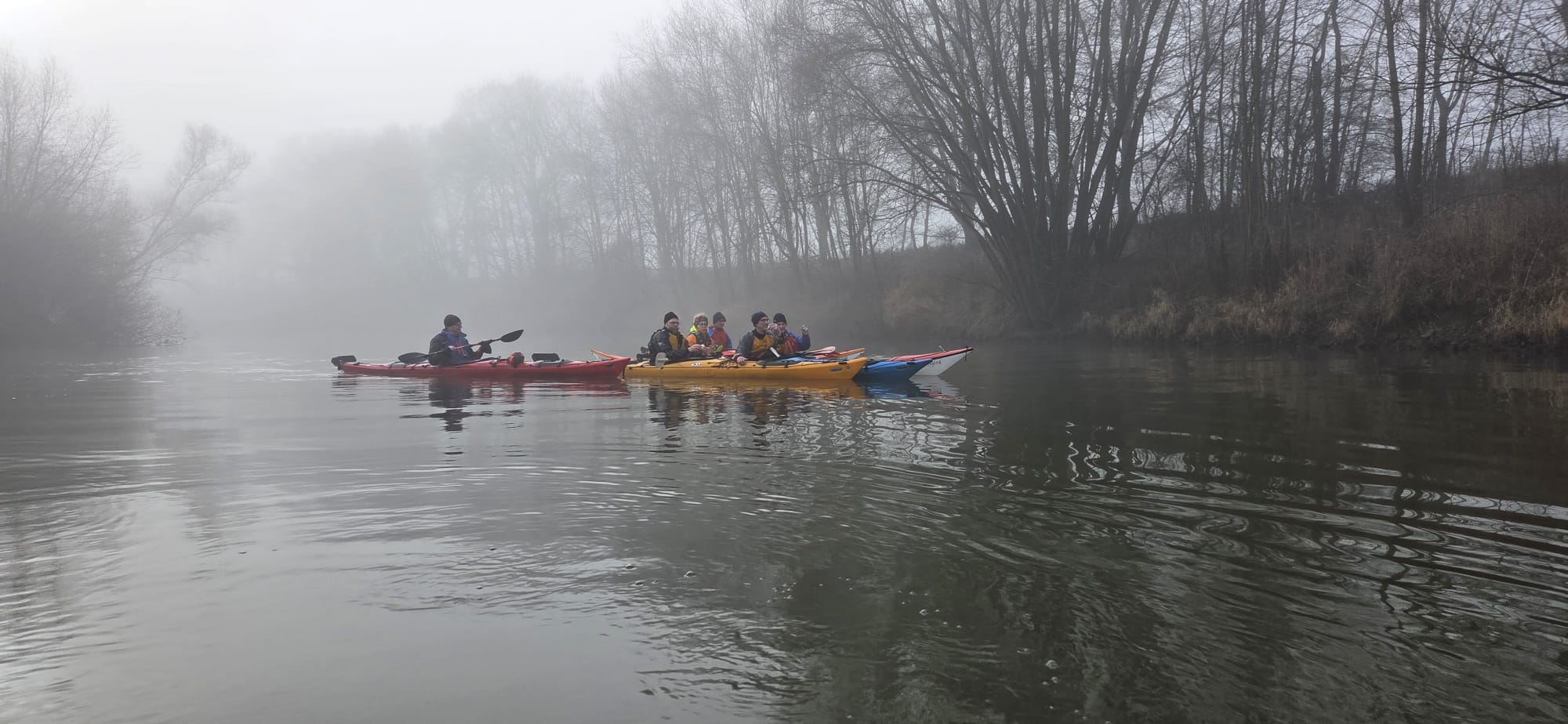Mit beladenem Hänger ging es erst zur Bodelschwinghbrücke, wo sich der Einstieg etwas mühsam gestaltete. Dank der flotten Strömung war das Ziel Salzbergen aber bereits nach etwa 1,5 Stunden erreicht. Was die Tour so einzigartig machte, war die Wetterlage. Der dichte Nebel, der die Sonne nur selten leicht durchschimmern ließ, hatte etwas mystisches.